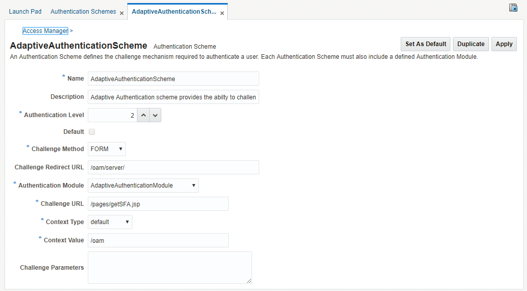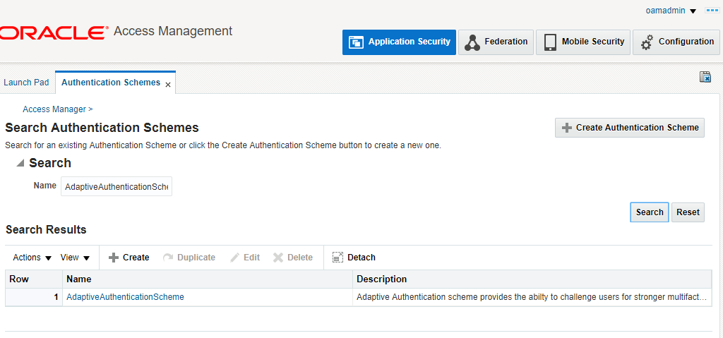 Administration and Configuration Guide Data Security and Data Privacy Multi-Factor Authentication Configuring AdaptiveAuthenticationModule Protecting the Resource with AdaptiveAuthenticationScheme Protecting the Resource with AdaptiveAuthenticationScheme The adaptiveAuthentication Scheme is used for two-factor authentication. To configure, perform the following steps: Login to OAM Admin Console and click Application Security. Figure 11-9 Application Security page From the Application Security tab and click Access Manager > Authentication Schemes. Search for AdaptiveAuthenticationScheme. Figure 11-10 Authentication Schemas tab Click AdaptiveAuthenticationScheme to view the details. Figure 11-11 Authentication Schemas window Verify the details and click Apply.