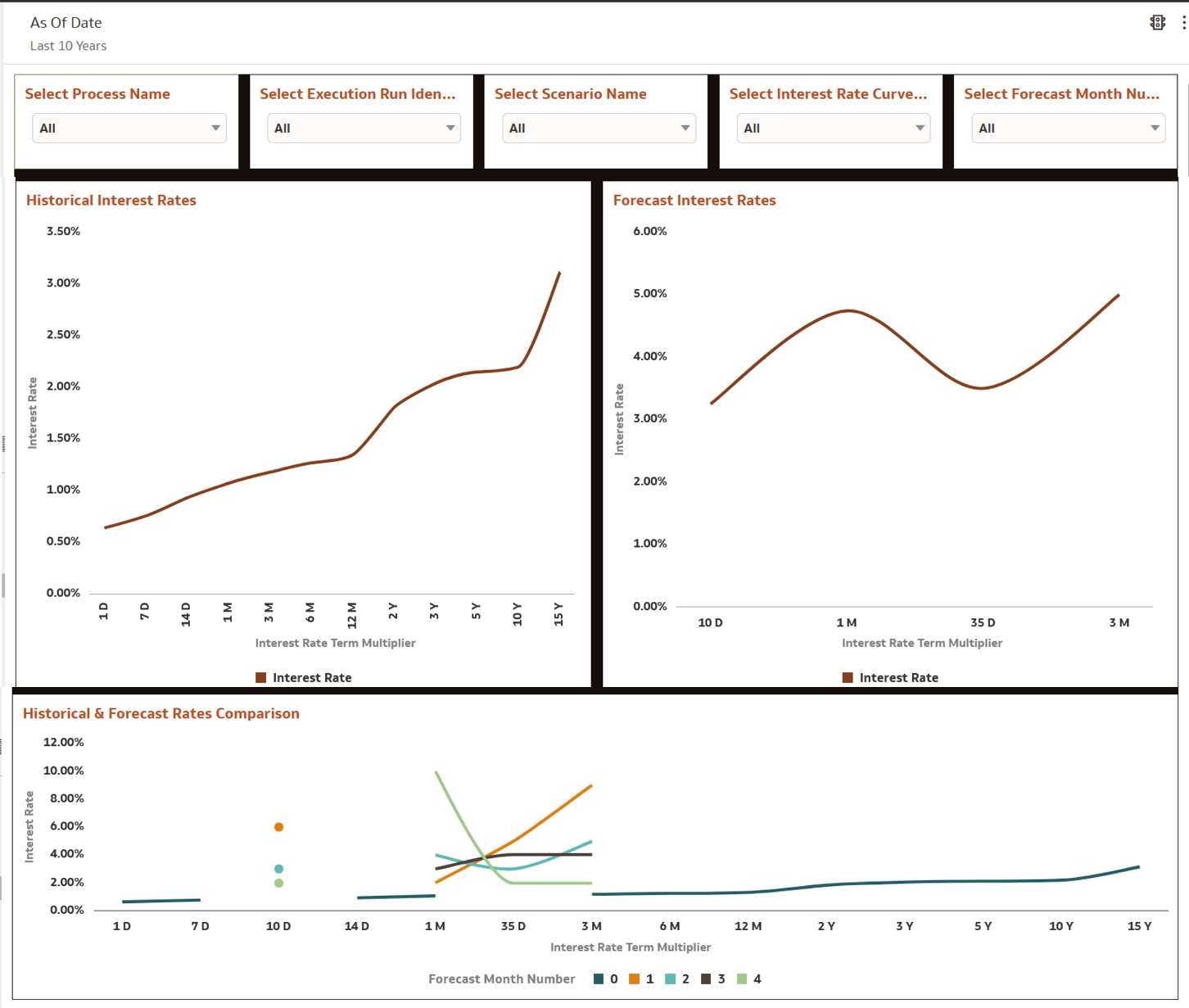 The List box filter provides you with a selection capability on the desired Interest Rate Curve utilized by the Forecast Interest Rate Output processes. This filter is dependent on the values selected in the Process Name, Execution Run Identifier, and Scenario filter. This is a Single select filter, without any selection the reports will not fetch any meaningful results.