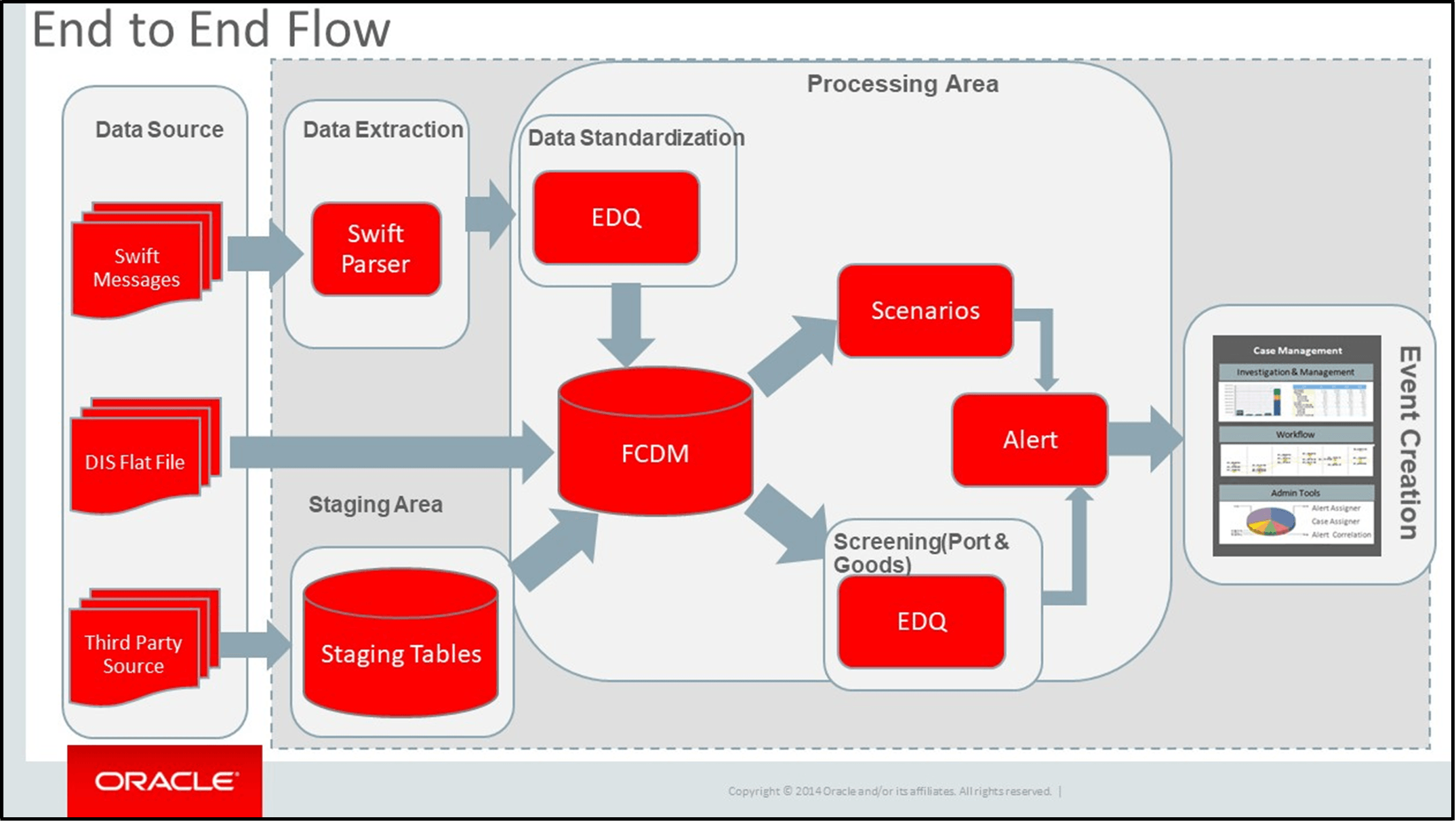 TBAML extracts data from SWIFT messages via the Swift Parser functionality. That data, and data provided by the Oracle client via DIS File or another source, is fed into staging tables and then into the FCDM where the data is either standardized (Port) and screened (Port, Goods, Name and Address) through EDQ functionality, or run through scenarios to generate an FCM event.