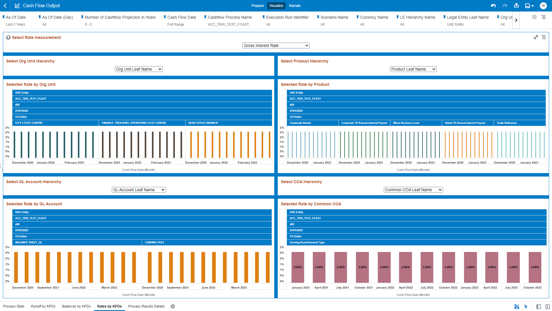 The “Rates by KPDs” Report provides the Cash Flow Output processes results related to the Rates measurements, you can drill down and roll up the results across hierarchies for the Key Processing Dimensions of Org Unit, Product, GL Account and Common COA.