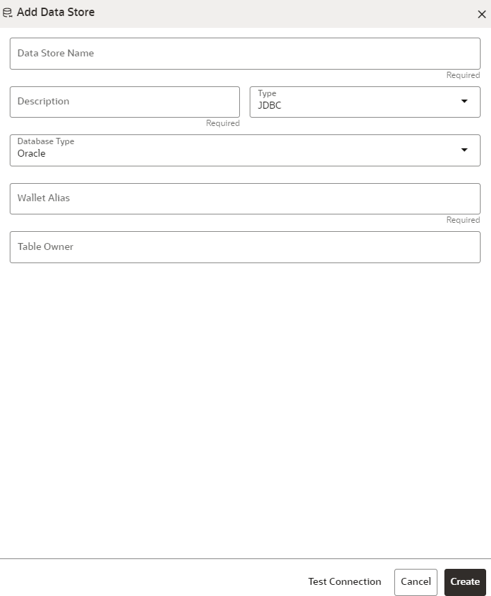 Field Description Data Store Name Enter the connection URL to the database for the data schema. Description Enter the description of database connection. Type From the Type drop-down list, select the JDBC Database Type From the Database Type drop-down list, select the Oracle. Wallet Alias Enter the Wallet Alias. This value should be same as configured using Oracle Wallet. Table Owner Enter the Oracle Database schema name. - Click Create to create/add a new data store for the sandbox workspace.