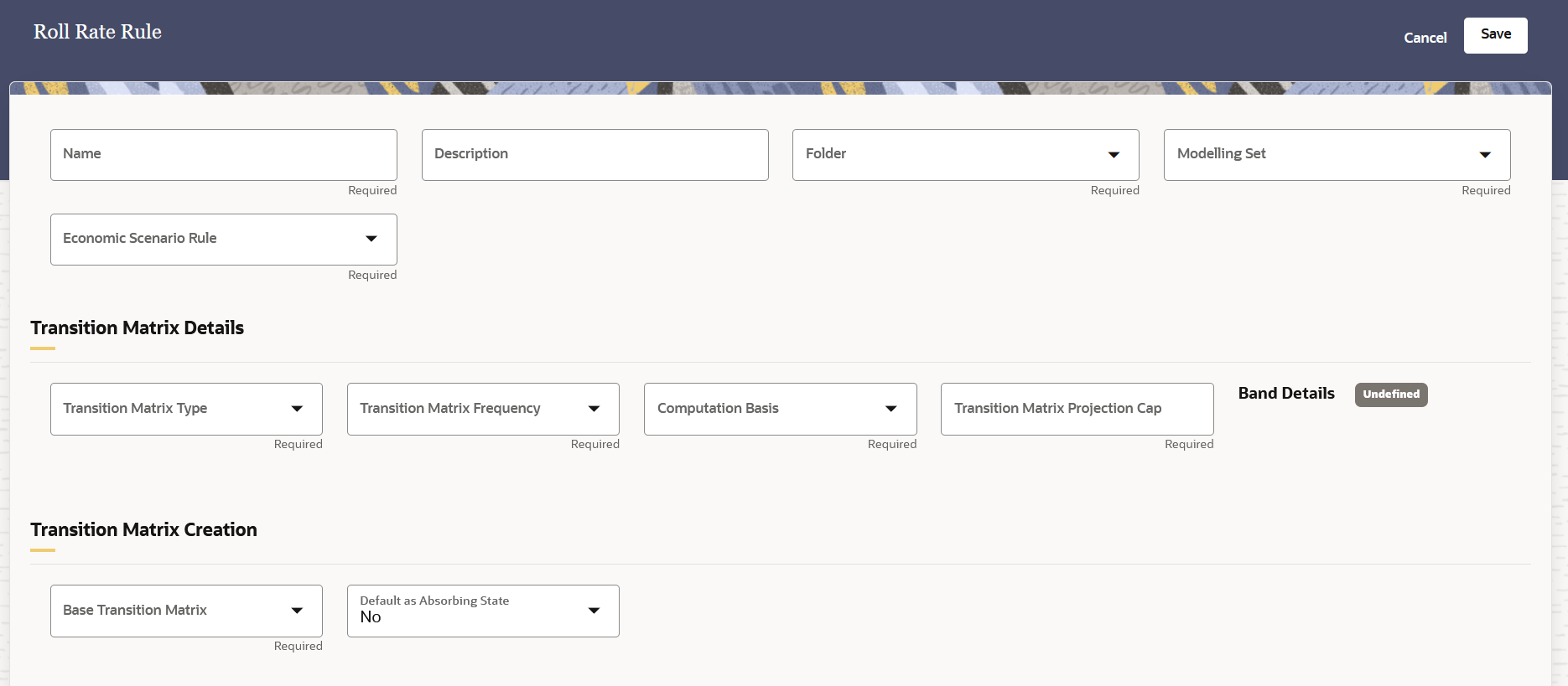 Field Description Name Enter a name. Description Enter a description for the rule. Folder Select a folder from the drop-down list Modelling Set Select a Modelling Set from the drop-down list Economic Scenario Rule Select an Economic Scenario Rule from the drop-down list. Transition Matrix Type (Transition Matrix Details) Select a transition matrix type from the drop-down list. The available options are: - Rating - If this option is selected, then the status of the Band Details will be Not Applicable.