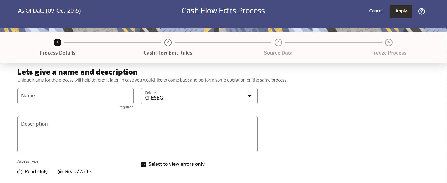 Field Description Name Enter the name of the Cash Flow Edits Process. Description Enter the description of the Cash Flow Edits Process. Select to view errors only Selecting this parameter allows you to view the results of running a Cash Flow Edits Process before the system updates the underlying records in the Instrument tables. The default value of this parameter is checked. Folder Enter the Folder details where Cash Flow Edits Process needs to be saved. Access Type Select the Access Type as Read-Only or Read/Write. - Click Apply to navigate to the Cash Flow Edits Rules