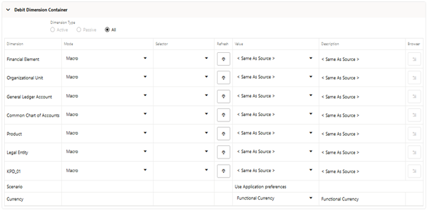 The Dimension Container starts with the Dimension Type radio button selection that displays the active, passive or all dimensions available for the allocation rule, through the options of Active, Passive and All respectively.