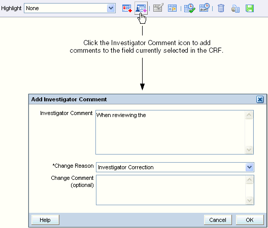 Position the cursor in the field you want to add the investigator comment to, and then click the Investigator Comment icon in the toolbar.