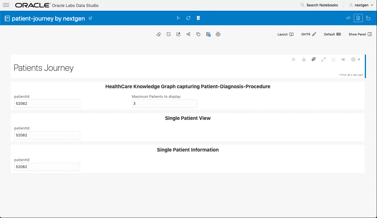 The notebooks are not pre-run when you navigate to either of the two notebooks, Patient Journey or Patients Like Mine. You must rerun the notebook whenever you navigate to these notebooks with a new Patient ID because the previous patient graph persists.