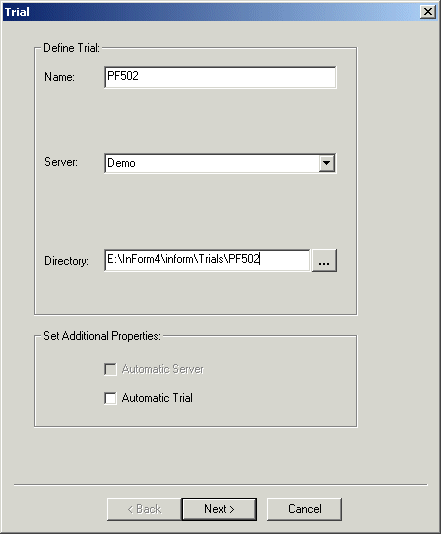 - In the Server box, select the name of the server on which the trial runs. If you want to set up a new server that is not in the list, clear the name currently showing in the Server box, and enter the name of the new server.