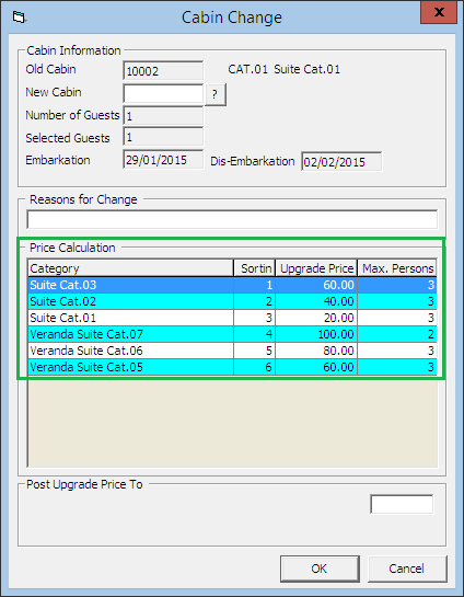 A cabin can become unavailable due to defect, or the guest may want to move to a larger cabin or cabin closer to their family/friends. This would require a cabin change. Depending on the policy and procedures of the Ship, such a change might be chargeable. If a fee is applicable, you can set this up in the Administration, Financial Setup, Stateroom Upgrade Prices module.