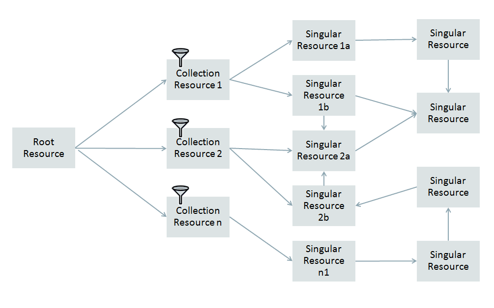 3. The HTTP API root resource links to collection resources, which support filtering, denoted by the filter symbol on top.