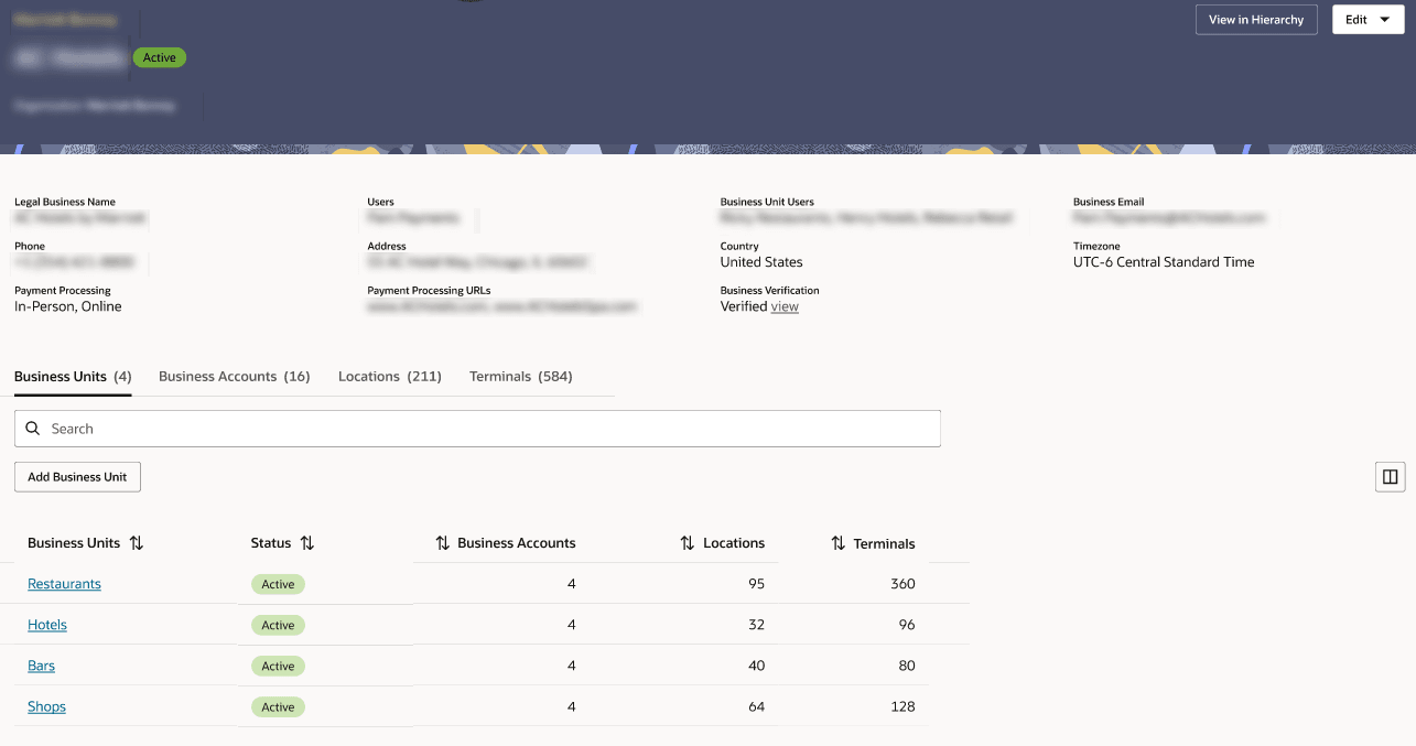 Click a business to see the contact details at the top of the page and a dashboard for business units, business accounts, locations, and terminals below that. See Businesses for more information. The following image shows the business after drilling down from the Business Management page.