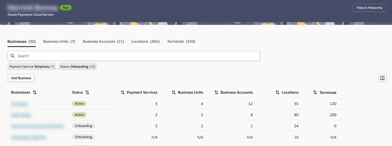 If you click on a business account, it shows the payment locations and terminals assigned to it. Statuses for locations include incomplete, not assigned, assigned, and in progress. See Locations and Sub-locations for more information.