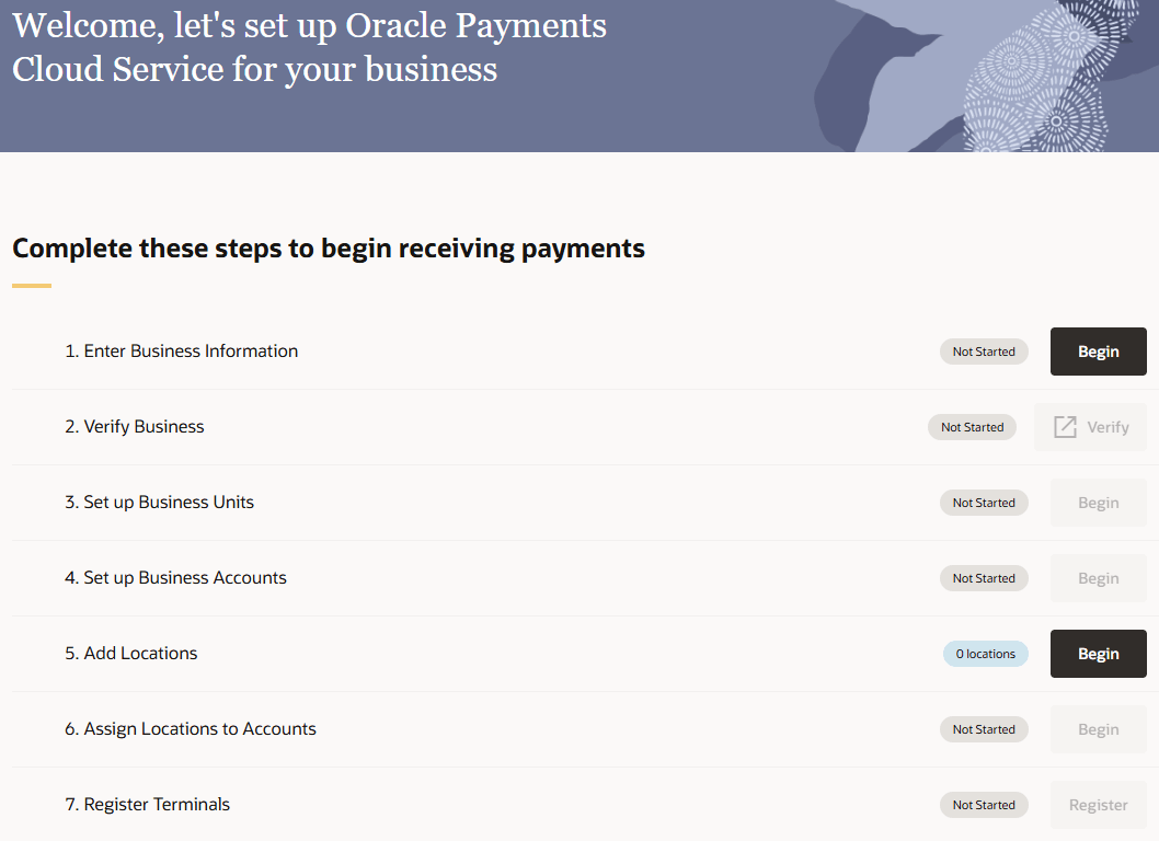 (Optional) Register terminals - Click Begin and then follow the steps in Register the Terminal. This is optional if terminals are not used to process in-person payments.