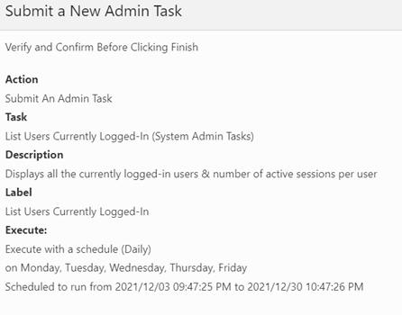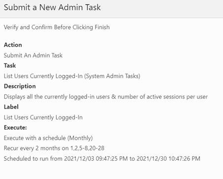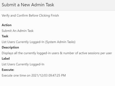 The user sees the Confirm Action page. Verify the options on this page and click Finish to submit this task for execution.
