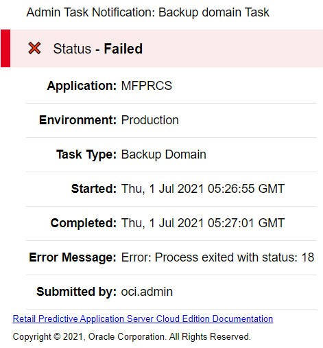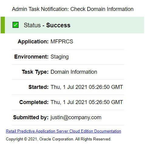 You can configure an email notification for each OAT task so that, when an OAT task ends, an email notification is sent the registered email addresses of the status of the task. Each OAT task and its success or failed status can be individually assigned one or more email addresses. This can be done through the Notification Administration interface of Retail Home.
