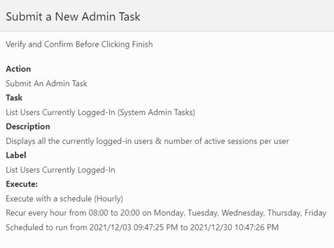 Display all the currently logged-in users and number of active sessions per user. From the UI, to export a list of active users to the outgoing/logs folder in the object store, select the check box Export list of logged-in users file to outgoing/logs path in Object Store. A csv file will be created at the destination. When listActiveUsers run from the back end, append the argument -export to the task to generate the csv file. |