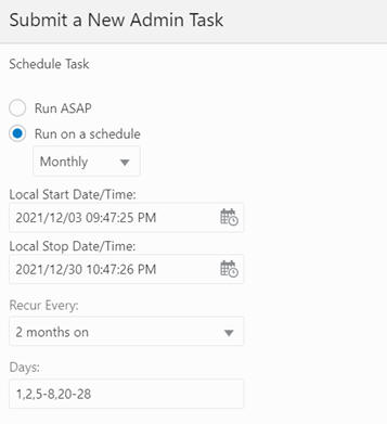 Start Date/Time - This is the time the task will execute for the first time. Note the first time execution. The recurring schedule will only be considered after the first run.