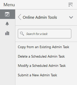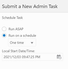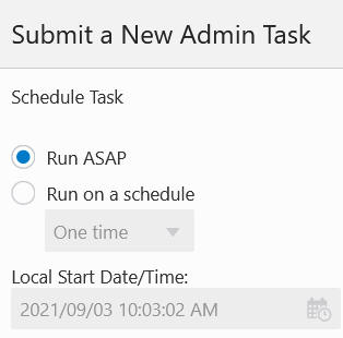 This template allows the administrator to copy a scheduled or completed administration task. The first wizard page provides a drop-down list for the user to select a task. Subsequent wizard pages are similar to those in the Submit a New Admin Task template, but with the argument selections populated with the values of the existing task.
