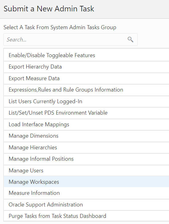 This online administration task can also be used to schedule all the administration templates (for example, Performance Diagnostic Tools, Security Administration, Translation Administration, and Measure Analysis).