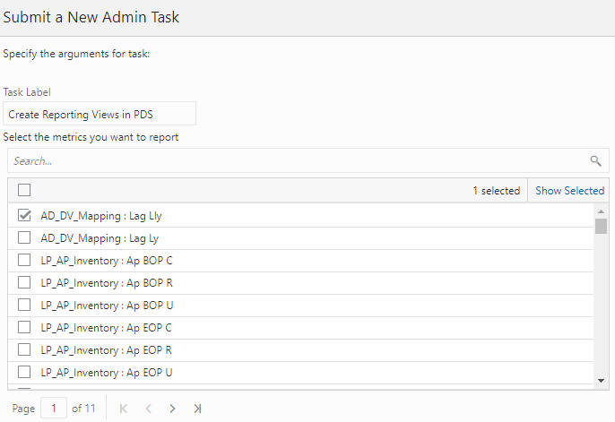 This operation is used to create database views for facts that can be selected. The views are used by Oracle Analytic Server (OAS) for data visualization/reporting. The facts, as shown in the OAT task Figure 3-19, are configured with Report Categories. (See Oracle Retail Predictive Application Server Cloud Edition Configuration Tools User Guide for details.) Note that the facts in the drop-down list are shown by their labels, which are created at configuration time. Navigation through various metrics is controlled using the Page numbering or Page Navigation options that are available in the bottom left corner of the screen.