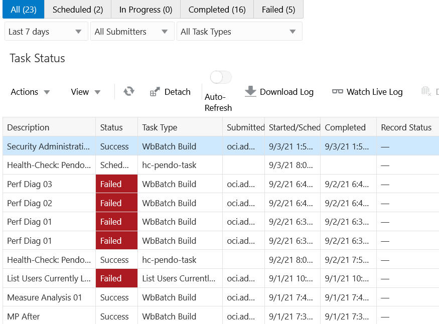 For any completed task, the user can download the log by selecting the row and clicking Watch Live Log or Download Log to fetch the log for the task. See Task Status Dashboard.