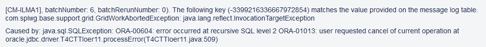 This error typically indicates that a timeout happened during the batch execution. This can happen if one of the jobs (Conversion and or ILM related) that should run in NOCACHE is run in Default by mistake. (For instance the re-build of an index on a large table can take some time, and under the Default TPW the operation might time out). Time out for Default TPW is 15 mins.