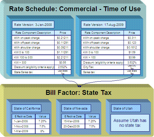 • Bill factors are used to specify the amount to charge when the amount is the same for many rates. Notice that both of the above rate versions reference the prevailing "state tax" bill factor rather than specifying the specific tax percent. This allows the tax rate to be maintained in one place.
