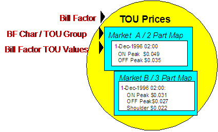 Bill Factor TOU values are typically used to record prices, which vary by time of use code. TOU prices are used in conjunction with time of use mapping. The customer would typically have interval quantities, which are mapped, using a TOU Map, into a collection of time of use quantities. Defining a bill factor with prices per TOU allows you to set up a single rate component to apply charges to these quantities, resulting in multiple bill calculation lines.