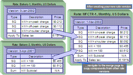 • You may have customer-specific rates that are very similar, but still unique. You can use this transaction to build a customer-specific rate. In this scenario, you may choose to create special 'mini' rate versions, one for each of the various options. Then, you could use the rate version merge page to select the components applicable for the new custom rate version.