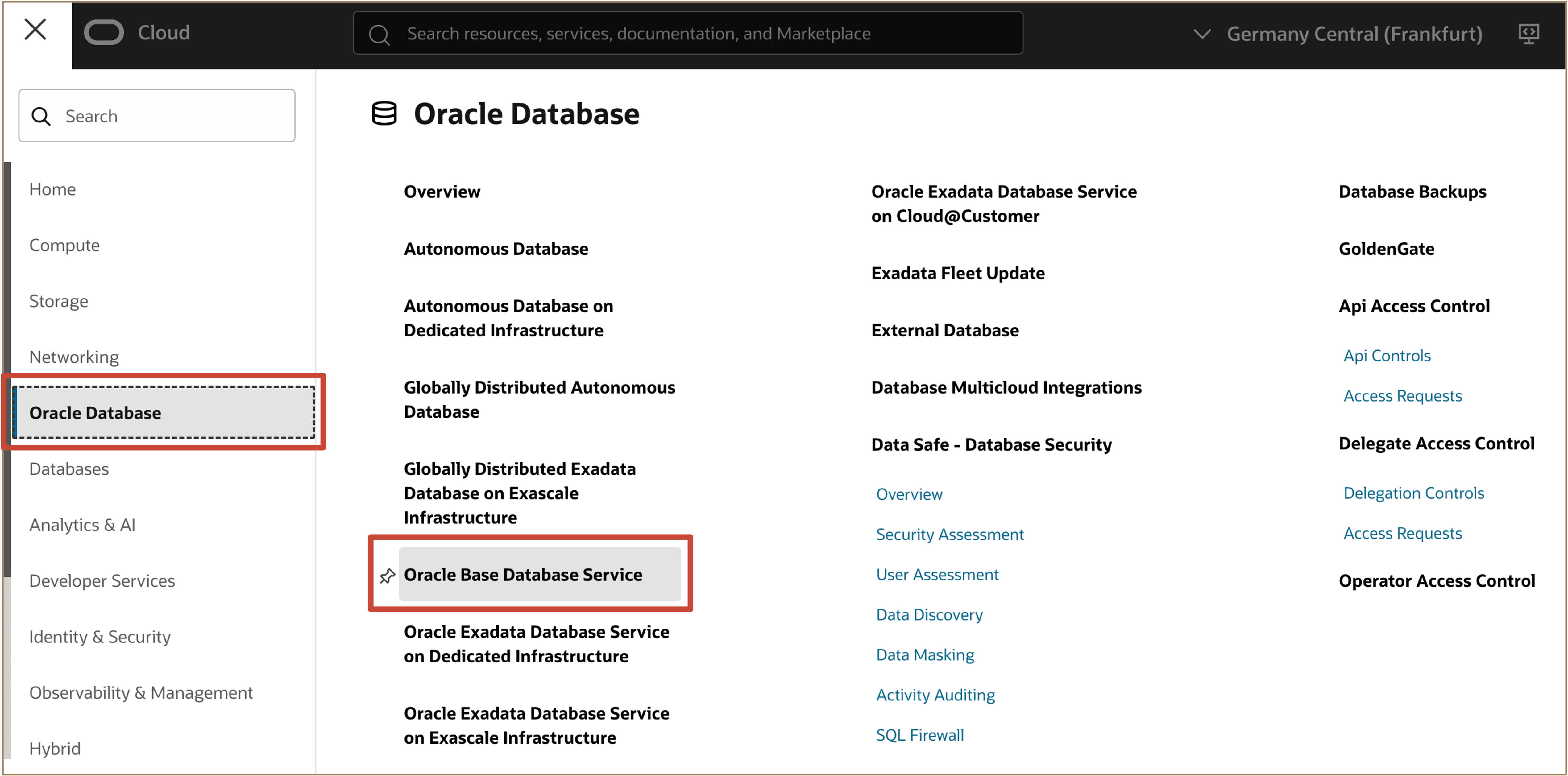 Open the navigation menu. Under Oracle Database, click Oracle Base Database Service.