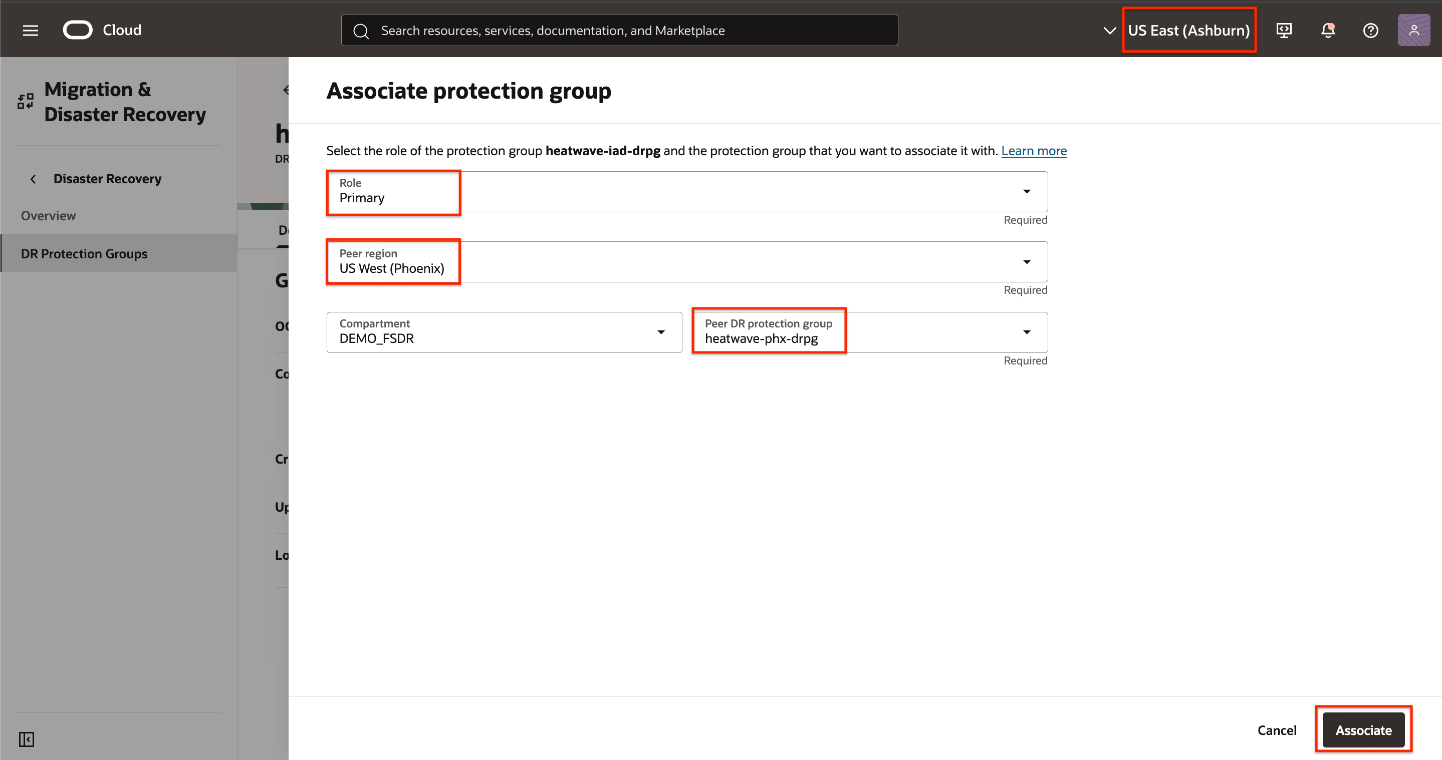 - Ensure that the correct DR protection group in Region 2 is selected, it should be the standby role.