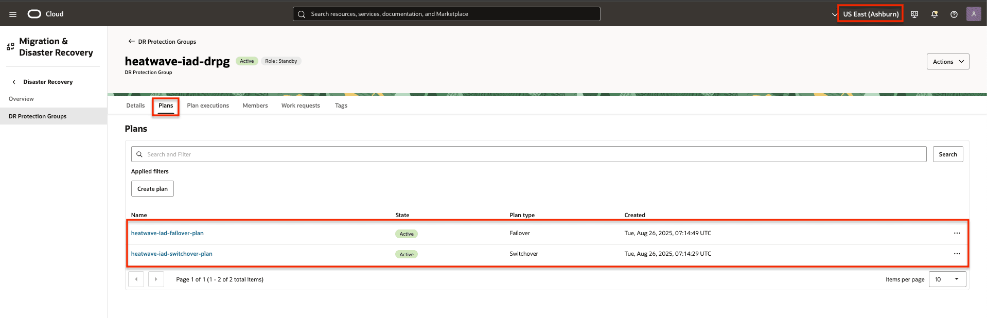 The standby DR protection group in Region 2 should now have the two DR plans. These will handle transitioning workloads from Region 1 to Region 2.