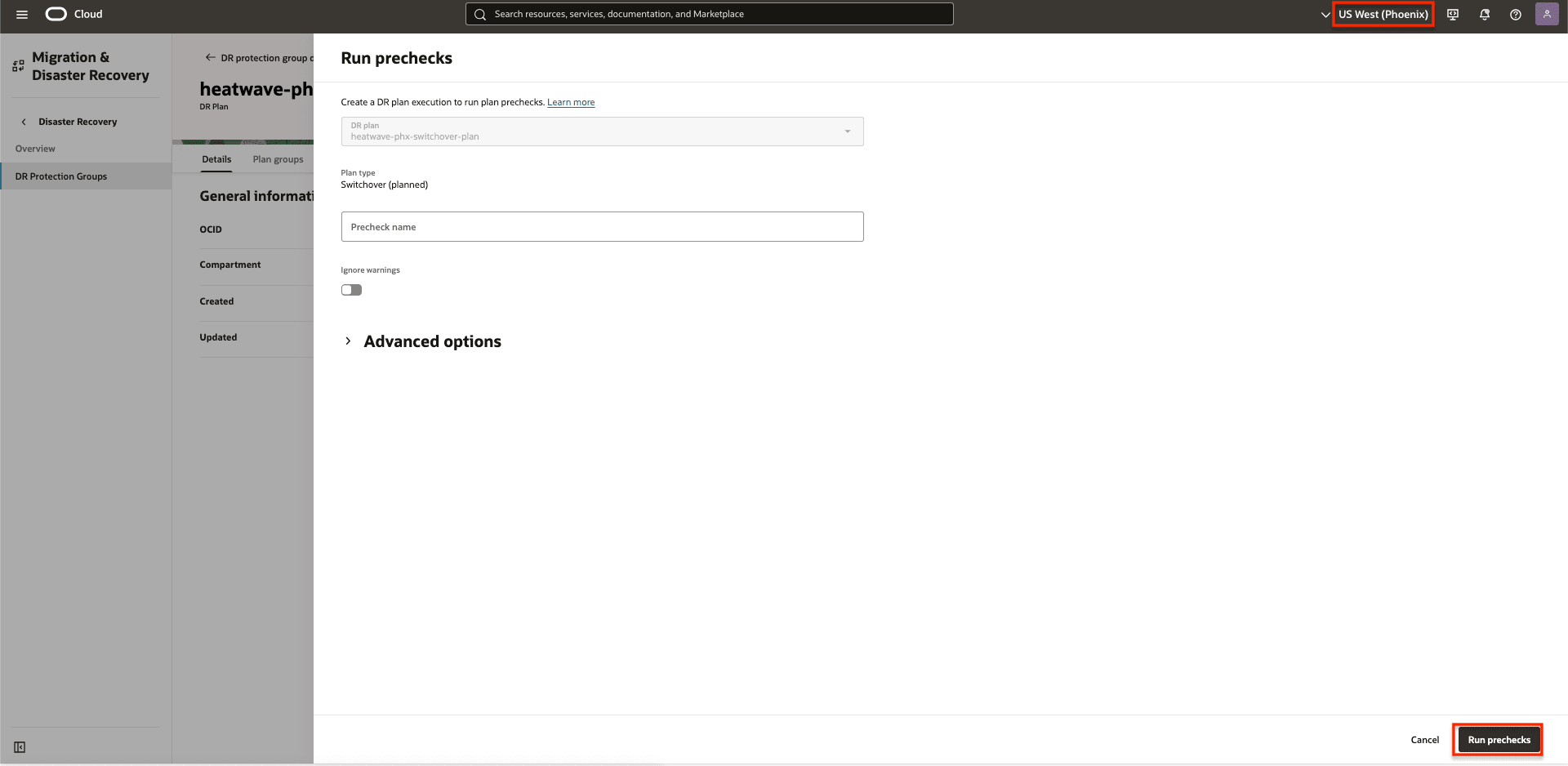 Run prechecks for the switchover DR plan.