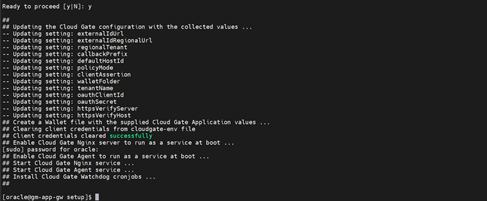 /scratch/oracle/cloudgate/ova/bin/setupfolder and execute the./setup-cloudgatecommand. When prompted, enteryto proceed with the configuration. Review and verify all parameters used for the cloud gate configuration.