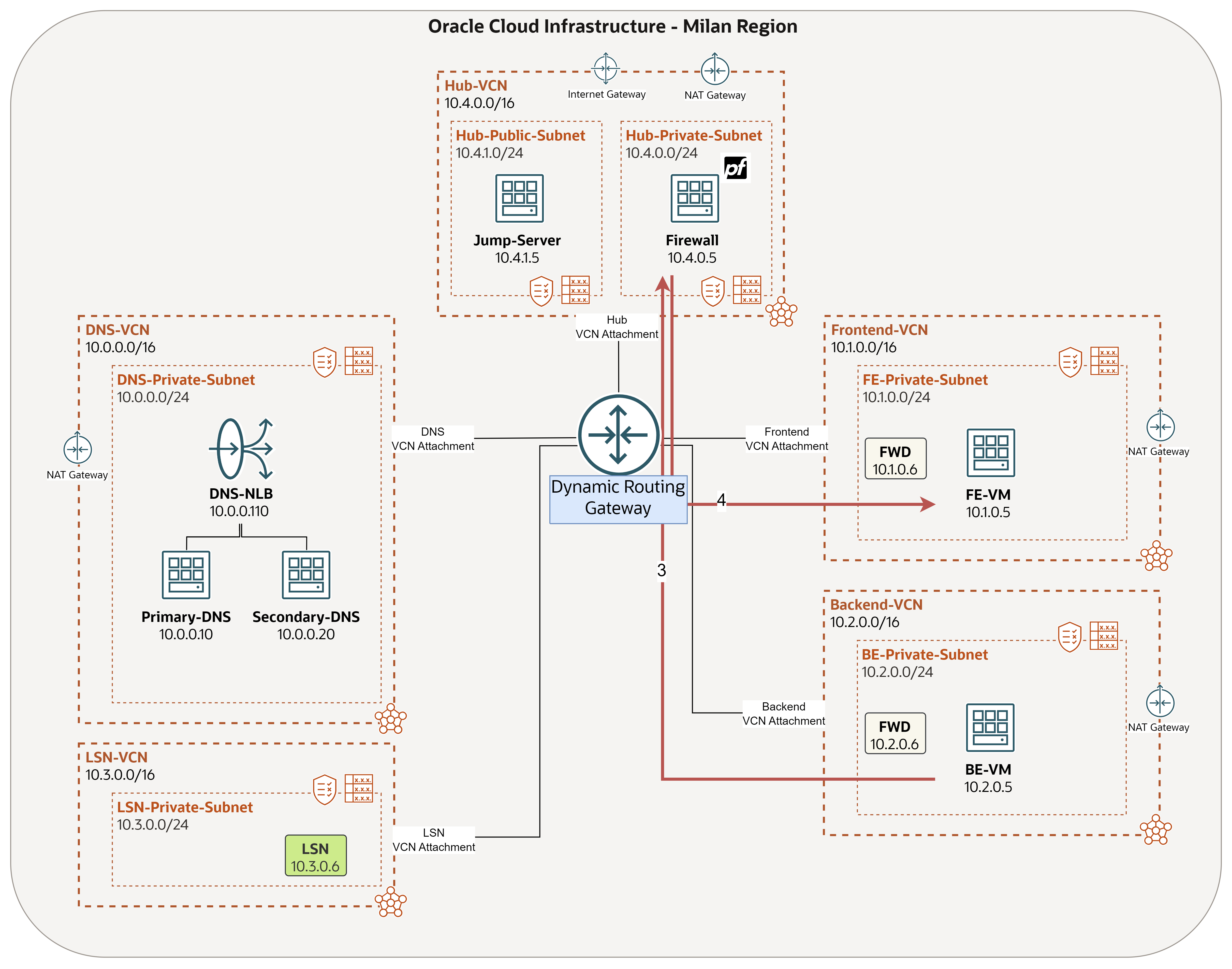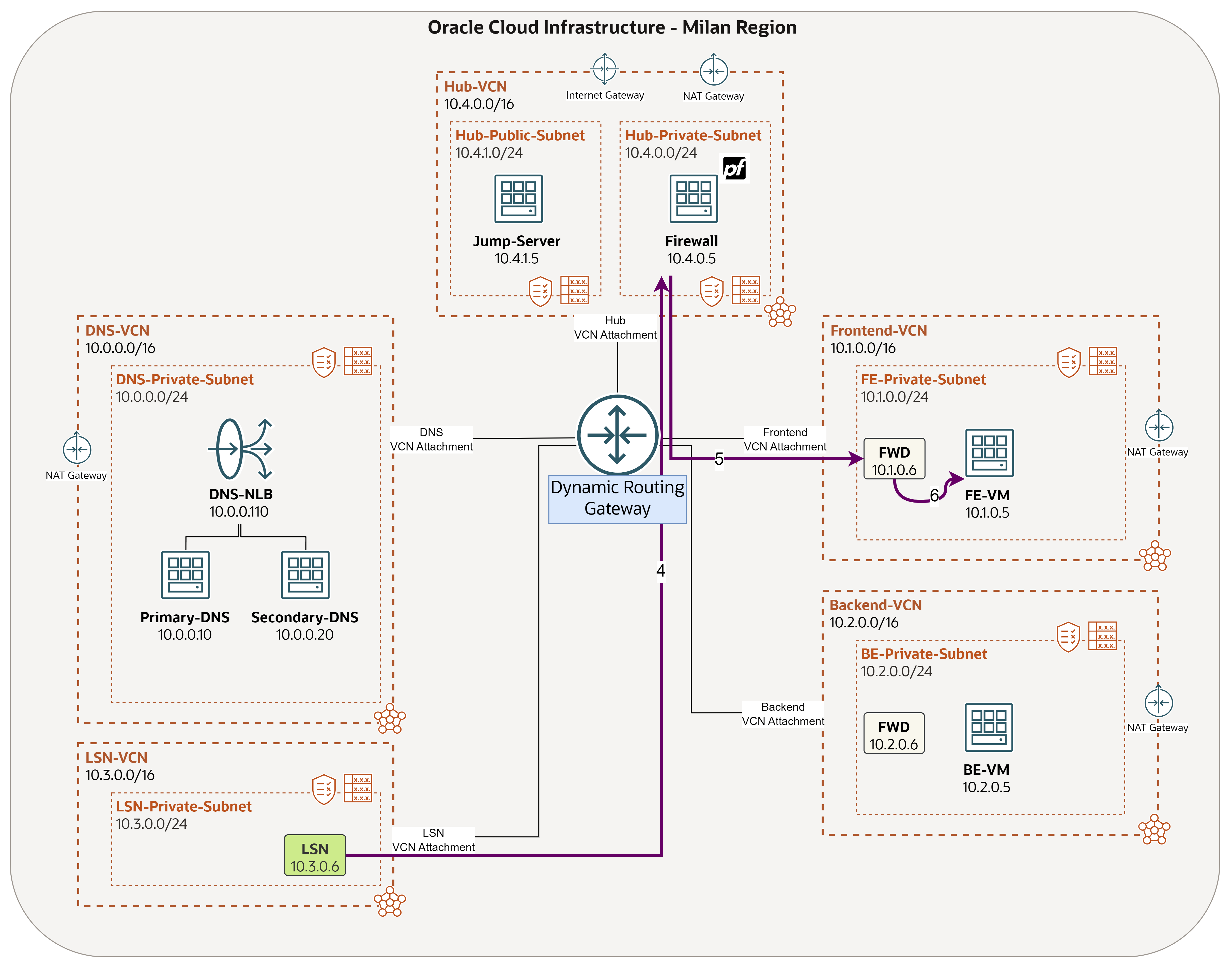 The purpose for this task is to make sure all traffic sent out of any of the networks (DNS/LSN/Frontend/Backend) and received on the DRG, to be routed towards the hub, where it will be inspected by the firewall.