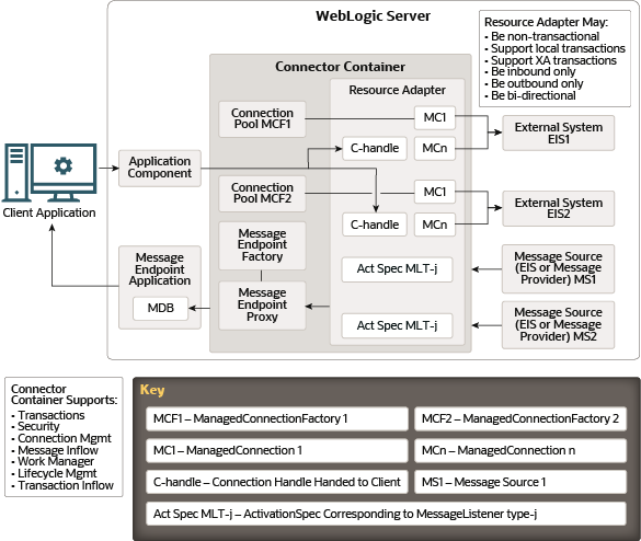 Figure 1-1 and the discussion that follows describe a WebLogic Server implementation of Connector Architecture 1.6.