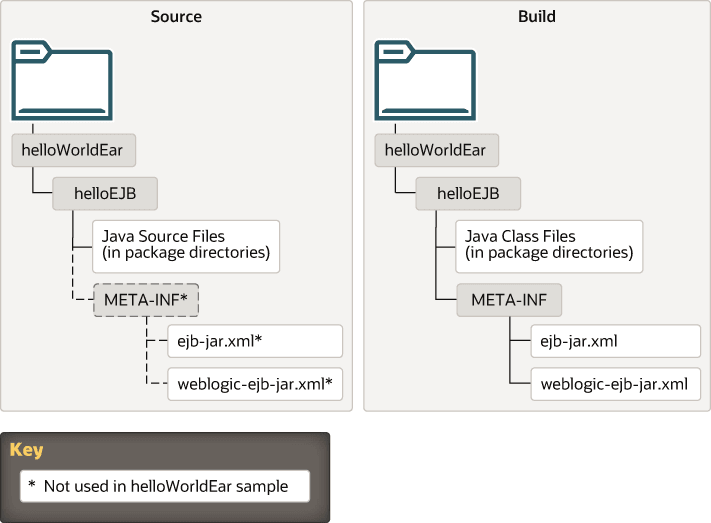 helloEJB\META-INF\—Store editable EJB deployment descriptors (ejb-jar.xml and weblogic-ejb-jar.xml) in theMETA-INFsubdirectory of the EJB module directory. ThehelloWorldEarsample does not include ahelloEJB\META-INFsubdirectory, because its deployment descriptors files are generated from annotations in the.ejbsource files. See Important Notes Regarding EJB Descriptors.