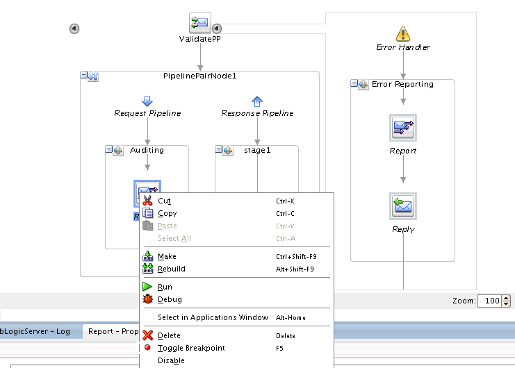 Company X navigates to the validatePayment pipeline to debug the pipeline in Oracle JDeveloper. Company X selects the Reporting action in the pipeline editor and right-clicks and selects Toggle Breakpoint from the menu.