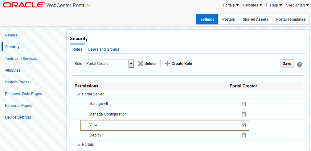 The Portal Server: View permission controls whether users have access to the Home portal. Administrators can disable access to everyone using WebCenter Portal or to specific users only. Use Table 2 to determine which permission settings are required for the different roles.