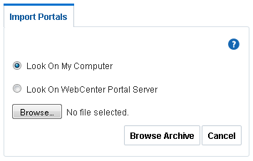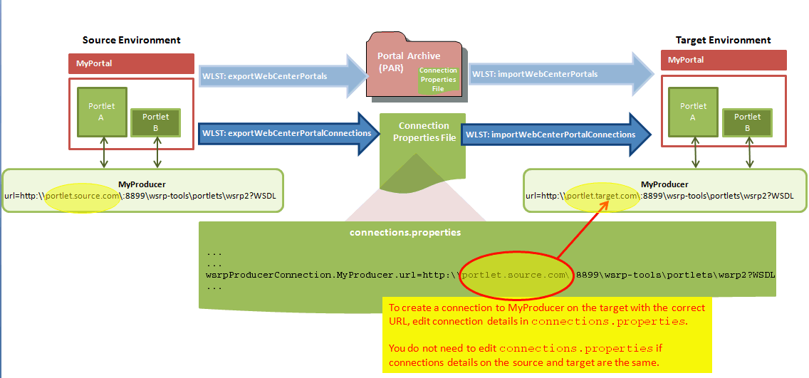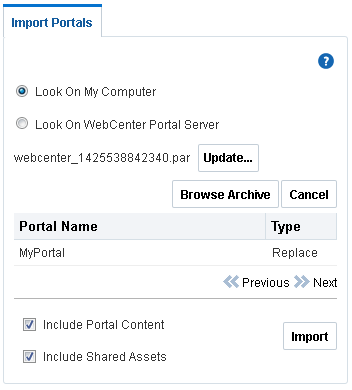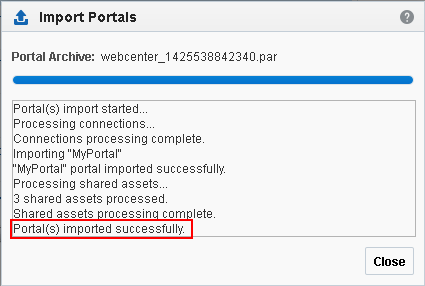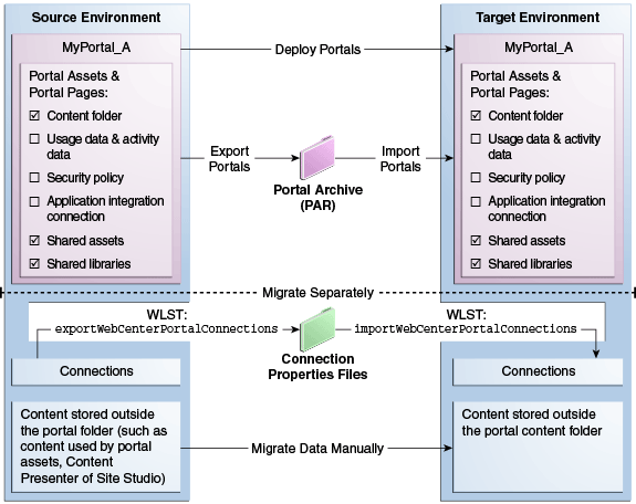 .parfile) of the source portal and import the archived portal on the target server by using WebCenter Portal Administration. You can also use WLST commands to export portals to an archive and then import portals from the file.For details, see Exporting and Importing Portal Archives.