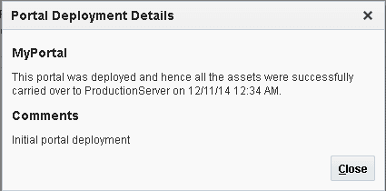 The Portal Deployment Details dialog displays the name of the target server and the date and time of deployment. It also shows the comments, if any, added while deploying the portal.
