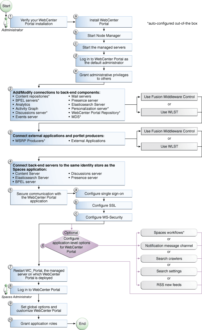 The flow chart depicted in Figure 1 and Table 1 in this section provide an overview of the tasks required to get WebCenter Portal up and running.