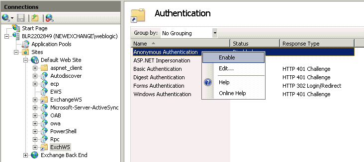 Right-click Anonymous Authentication and select Enable to enable Anonymous Authentication for the EWS application.