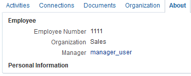 Now user1 and user2 are managed by manager_user. You can check this by logging in to WebCenter Portal as user1 and navigating to the About tab of the Profile page. The user manager_user is shown as the manager (Figure 10).