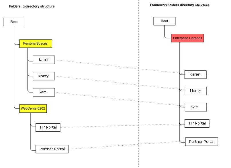 When WebCenter Portal uses a Content Server repository with Folders_g enabled, portals are stored under the WebCenter Portal root folder. Each user has a personal folder (the Home portal) stored under the path /PersonalSpaces, and this folder is named after the user. Whereas, when WebCenter Portal is configured to use FrameworkFolders, all portal folders and personal folders are treated as enterprise libraries and are stored under the path /Enterprise Libraries. Portal folders are named after the portal and personal folders are usually named after the user.