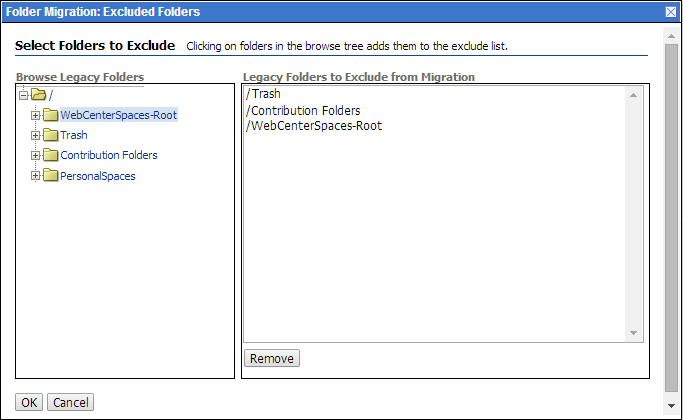 In the Folder Migration: Excluded Folders dialog, ensure that all folders other than the WebCenter Portal root folder appear in the Legacy Folders to Exclude from Migration box. In Figure 7,