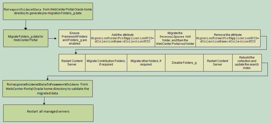 The flow chart (Figure 4) and the table (Table 1) in this section provide an overview of the steps required to migrate WebCenter Portal content from Folders_g to FrameworkFolders.