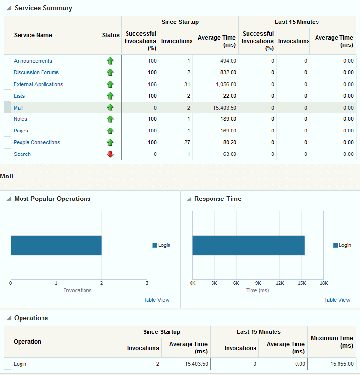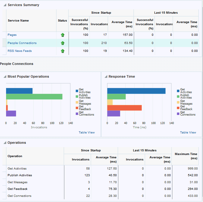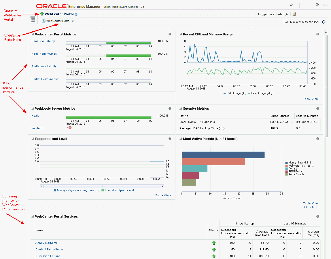 Oracle WebCenter Portal’s key performance metrics are specifically selected to help administrators quickly identity and diagnose common issues that can impact WebCenter Portal performance. You can view all key performance metric data from your application’s home page in Fusion Middleware Control.