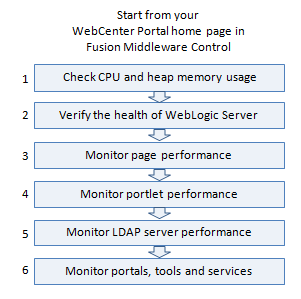 Diagnosing the availability and performance of WebCenter Portal typically requires that you look at various important metrics across multiple components such as the JVM, the WebLogic Server, as well as the application.
