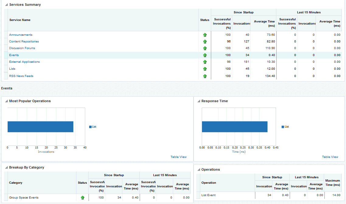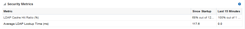 In addition to Since Startup metrics, Oracle WebCenter Portal reports metrics for requests serviced in the last 10 to 15 minutes as Recent History metrics. To do this, Oracle WebCenter Portal takes regular snapshots of real time metrics at an internal frequency. These metric snapshots are used to calculate the “delta” time spent performing service requests in the last 10 to 15 minutes and this data displays as Recent History metrics. Since Recent History metrics only aggregate data for the last 10-15 minutes, this information is useful if you want to investigate ongoing performance/availability issues.