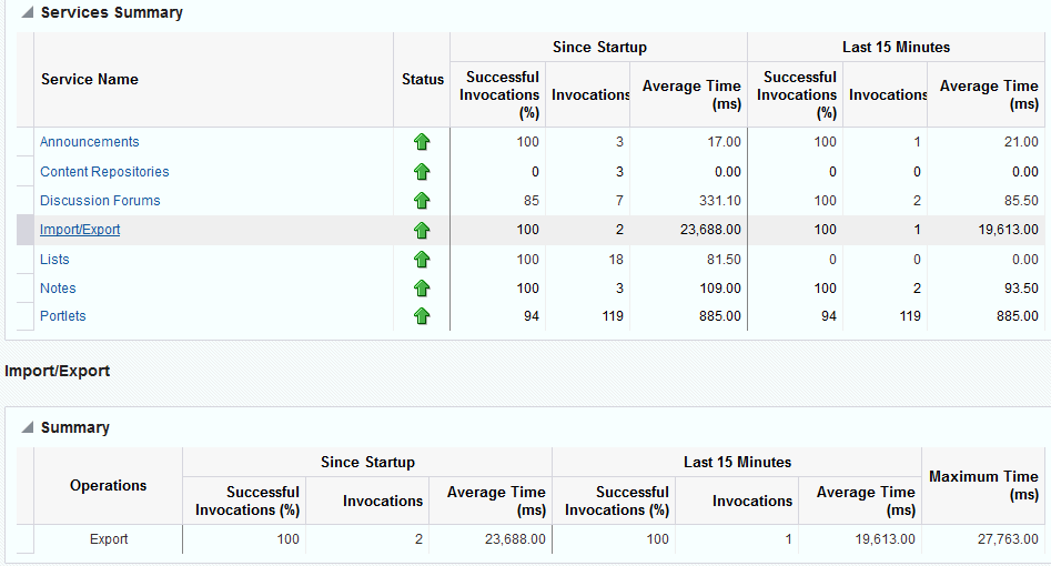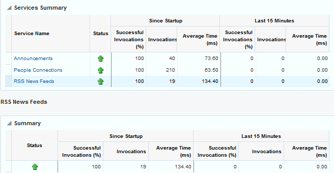 For example, consider a system that has been up and running for 2 days. During that time, Oracle WebCenter Portal recorded that the total time spent servicing 100, 000 portlet requests was 5 000 000 ms. The system starts to experience performance issues, that is, in the last 10-15 minutes, 100 portlet requests took a total time of 3 000 000 ms. In this scenario, the average response time reported “Since Startup” is quite low and would not indicate a performance issue (5 000 000ms/100 000 = 50ms). However, the same Recent History metric is considerably higher (3000000ms/100 = 30 seconds) which immediately tells the administrator that performance degraded recently. A quick comparison of “Recent History” with the corresponding “Since Startup” metric can clearly show whether or not the recent metric data is normal and in this case shows there is currently a problem with the system.